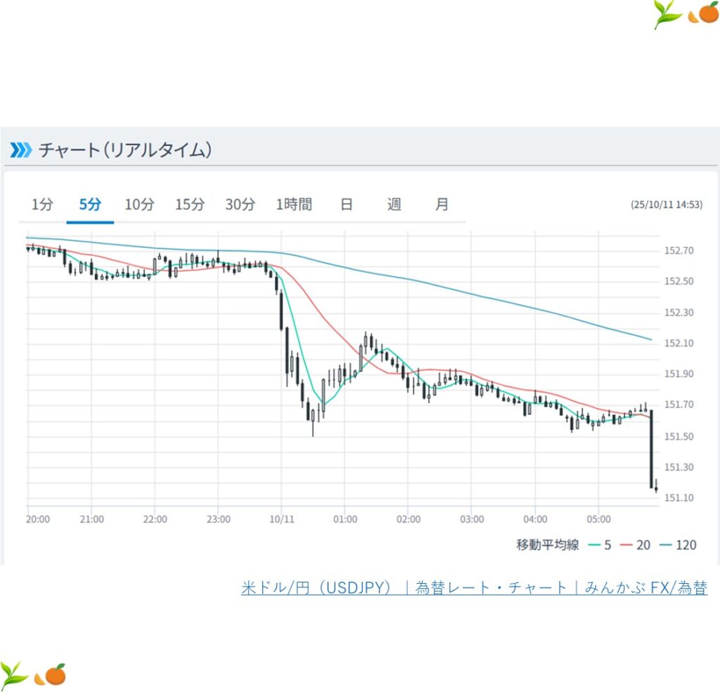 ただし、週末の10月10日(金)にはトランプ前大統領の対中国関税警告発言を契機に急落し、日足ベースで –2.7 %の大幅下落 という報道も出ています。 - 週間トータルでは、終盤の下押しもあって 週ベースではマイナス圧力がかかった可能性が高いという見方が、複数報道で示されています。