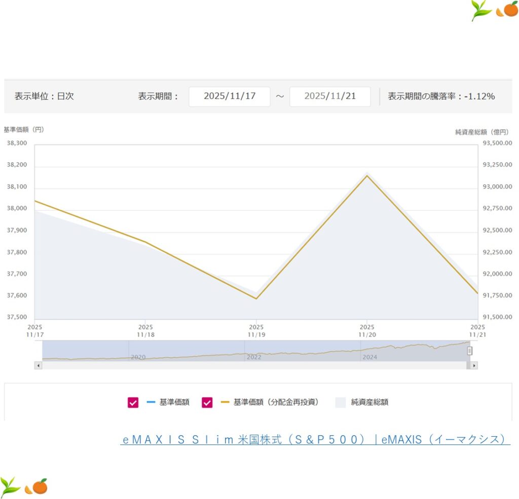 - この週においてeMAXIS Slim S&P500の基準価格は下落傾向にありました。nvida決算を受けて11/20に上昇したものの、翌11/21には大きく下げました。