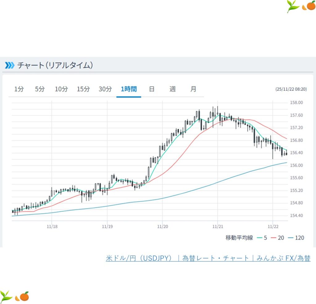 - この週、ドル/円は円安方向(ドル高・円安)に動いています。具体には、11月17日には1ドル=約 \154円半ば。11月21日には1ドル=約 ¥156後半 になりました。